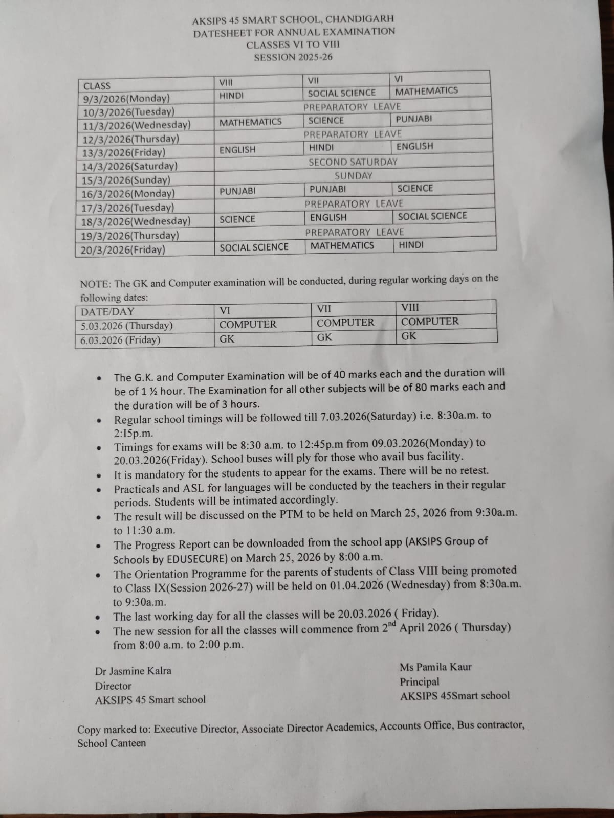 DATESHEET OF CLASSES VI TO VIII